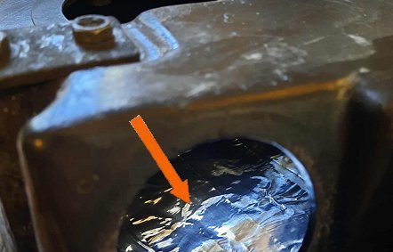 Given it is not possible to add metal by welding so close the line (at risk of damaging it), the only way consists in fixing an aluminum part by welding it on the exhaust pipe side. In red here above the part to fix in order to reduce the exhaust timing and, and in the following pictures, the aluminium part during adjustement process (by the way, have a glance to the differences on the fins brightness once the cylinder was sandblasted). The last picture below is a view from inside, once the shim welded: